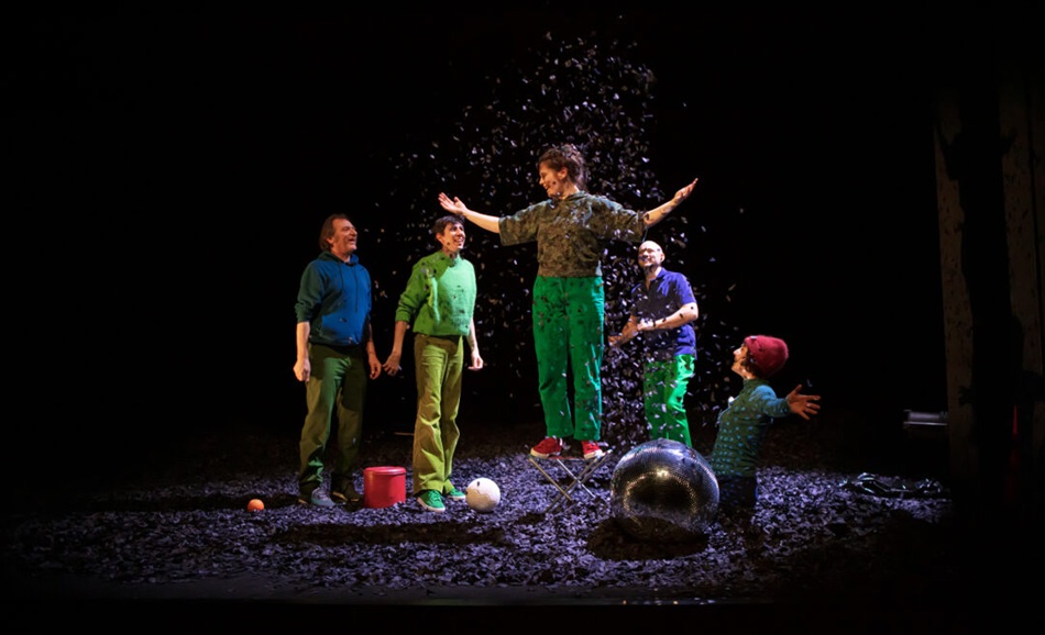 Sur scène, on devine un paysage. Des feuilles mortes jonchent le sol par milliers. Voici qu’arrivent cinq personnages. En fouillant, ils découvrent toutes sortes d’objets auxquels ils vont tenter de trouver un nom, explorant de manière joyeuse et poétique cette question fondamentale : quel lien entre le nom des choses et leur réalité ? Les acteur·rices jouent sans réserve avec les mots, leurs racines et leur sens, renomment les objets et les métamorphosent, jusqu’à faire surgir tout un univers sous nos yeux.