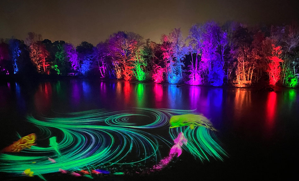 Avec ses 14 000 m² de surface, l’étang central du Parc devient, le temps d’une soirée, un lac de lumière et de mystère. Les reflets dansent sur l’eau, dessinant des constellations éphémères, des oiseaux fantômes, des paysages oniriques. Ici, une projection géante fait naître des vagues de couleurs, là, des lueurs bleutées semblent inviter les visiteurs à plonger dans un autre monde.