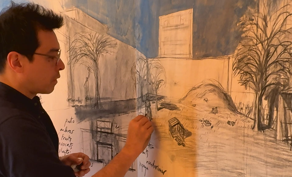 L'idée est aussi simple que bouleversante : un artiste, Stephan Zimmerli, s'est installé dans une cabane en bois au milieu du théâtre. Pas pour jouer à cache-cache, quoique, mais pour écouter et observer. Onze enfants exilés, âgés de 8 à 17 ans, venus d'Ukraine, d'Afghanistan, du Kazakhstan, du Venezuela, de Côte d'Ivoire ou encore du Qatar, lui ont raconté un lieu perdu. Leur jardin d'avant. La rue de leur enfance. La maison de grand-mère restée là-bas. Et lui, au fusain, en temps réel, a dessiné ce qu'ils décrivaient. Séance après séance, deux heures chacune, uniquement armés de leurs mots et de leur mémoire.