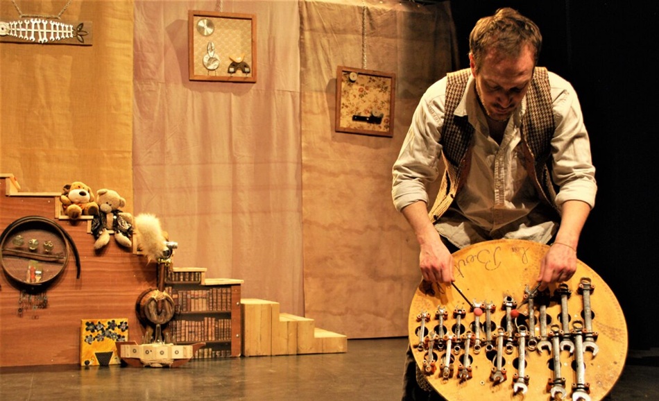 Le décor du spectacle est composé d’objets de récupération qui ont été détournés de leur usage quotidien pour servir la création sonore et musicale du spectacle : casseroles, moules à gâteaux, tournevis, abat-jours, peluches rembourrées…Un véritable « musée portatif » qui allie art et développement durable !