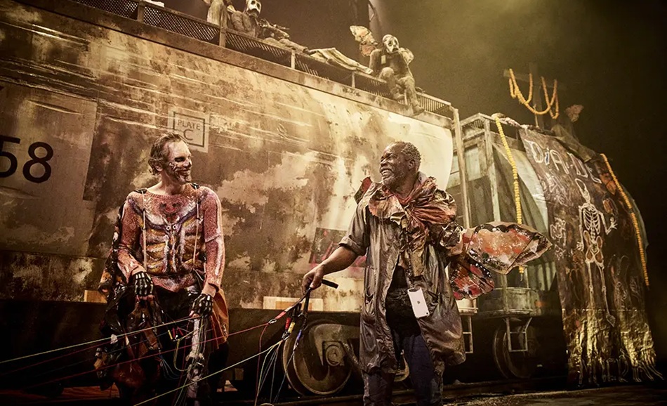 S’apprête-il à décoller ou vient-il d’atterrir ? Ce parapentiste à la toile froissée s’est lancé un défi : relier la région des Grands Lacs canadiens aux montagnes mexicaines du Michoacán. Un périple sur les traces de la plus longue migration saisonnière observée chez un insecte : celle des papillons monarques, de moins en moins nombreux en raison du réchauffement climatique. Au même moment, un jeune homme juché sur une carcasse de wagon tente la traversée inverse, du sud au nord, pour fuir la misère en enjambant le « mur Trump ». Au départ, chacun vit dans sa bulle. Mais, peu à peu, les acteurs Julien Chavrial et Jean-Erns Marie-Louise font résonner leurs trajectoires et créent des échos bouleversants sur un plateau baigné d’une lumière crépusculaire. Après avoir donné la parole aux femmes et aux hommes blessés de Sorj Chalandon, Russell Banks ou Svetlana Alexievitch (Mon traître, De beaux lendemains, La Fin de l’homme rouge), Emmanuel Meirieu revient à l’écriture. Il explore le lien de l’humain à la nature et au cosmos. Et bâtit un sanctuaire en déployant son théâtre de la fragilité.