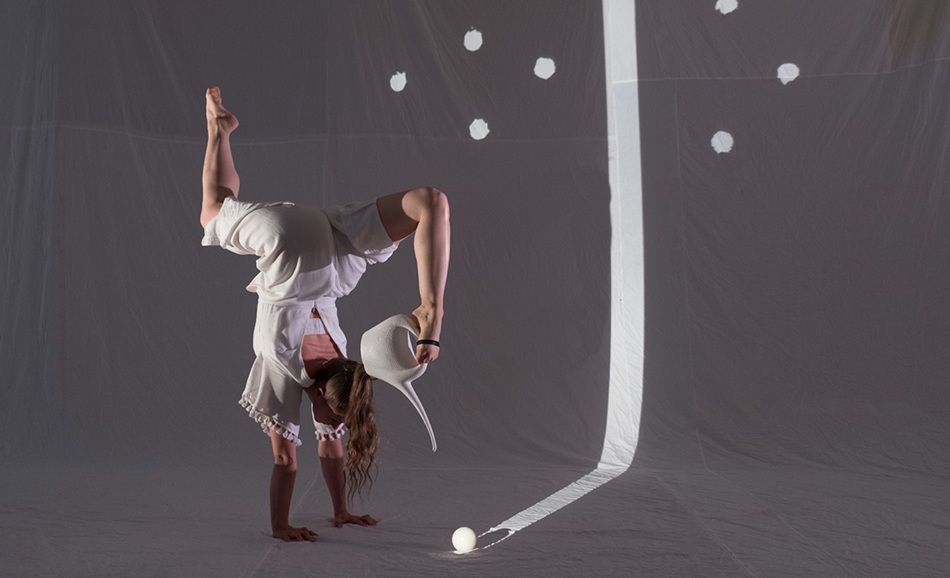 Sur une scène immaculée, comme une page à écrire, un duo rencontre un point (piste en finnois). Il scintille, rebondit, s’échappe. Est-ce la lune ? Une balle ? Un insecte ? Peut-être un peu tout ça à la fois. Les deux artistes jouent, dansent, jonglent, et se laissent emporter par cette étrange petite chose qui semble avoir sa propre volonté et être un poil joueuse. Comme par magie, le point passe d’une simple projection à une balle qui jongle entre les mains du duo. Par un jeu d’ombres et de lumières fascinant, les objets prennent du relief, le perdent, et se transforment pour raconter une nouvelle histoire.