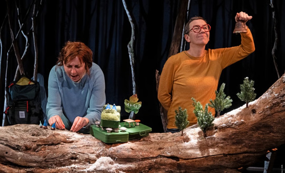 Partant du conte de Grégoire Solotareff, un farfelu récit teinté de comique et de gravité se déploie. Trois interprètes manipulent de petits êtres à bonnet de laine et prennent leurs mimiques et leur malice. Sur scène, on aperçoit le tronc d’un pommier : le village des lutins. L’incroyable scénographie de Valentin Périlleux (Alberta Tonnerre, au Ciel en janvier 2024) offre son lot d’inattendus et d’émerveillement. Cette paisible communauté sera bientôt le théâtre de bien des travers humains…