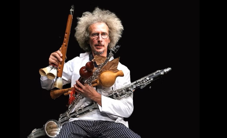 Il a dans ses bagages, des tableaux, des portraits de famille et une myriade d’instruments qui étayent sa démonstration. De la feuille de Cromagnon au sylphyo (clarinette électronique) en passant par le cor de basset de Mozart, il débale et joue le mijwiz syrien, le hulusi chinois, la birbynè, le pakou, la clarinette basse et bien d’autres...De la Méditerranée à la Chine, de la vieille Europe et de l’Amérique à l'ESPACE !