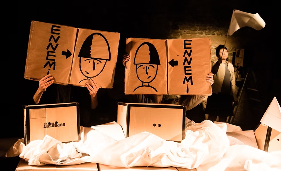 Entre théâtre, chorégraphie et musique live, cette équipe originaire du Brésil nous invite à réfléchir sur la guerre, les conflits, les désaccords. Au moyen d’accessoires simples en carton et matières brutes, ils et elles déploient un système des symboles, des formes et des couleurs évocatrices, et en détournent le sens.