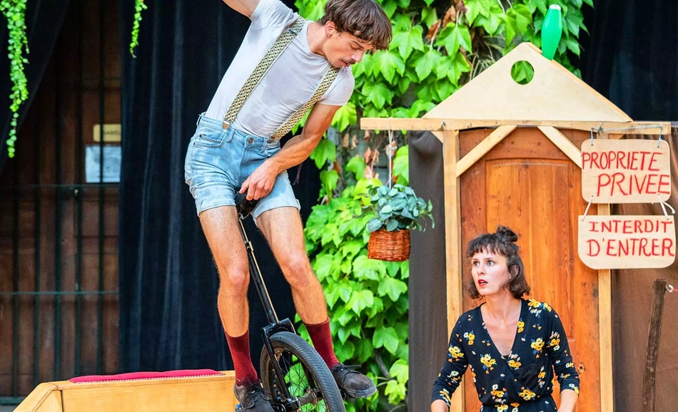 Dans l’hostilité de ce monde, on regarde ses voisins de travers, on épie, on se méfie, on a peur… parce qu’on ne se connait pas. Personnalités différentes et moyens d’expression divergents, tout prête à l’incompréhension entre ces deux personnages. Portés sur monocycle, main à main et jonglage les lient, eux qui se fréquentent la tête en bas et partagent la même roue. Pour donner tort à l’expression « chacun chez soi et les moutons seront bien gardés » et pour partager avec le public un moment d’accueil et de tolérance, Étranges Étrangers offre quelques instants de légèreté et d’optimisme. Mais si l’un empiète sur le territoire de l’autre, alors que se passe-t-il ?