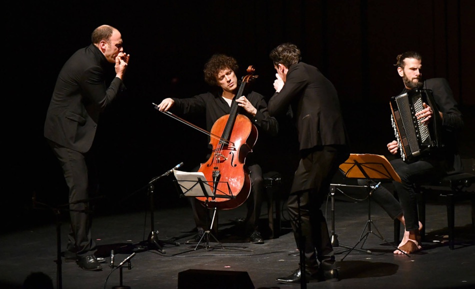 Un accord simple répété par Vincent Peirani, une belle mélodie du compositeur estonien Arvo Pärt, esquissée par François Salque, puis le Cantus Arcticus de Rautavaara, compositeur finlandais. Derrière eux, Johnny Rasse et Jean Boucault, les chanteurs d'oiseaux, comme s’ils guettaient près d’un étang baigné de brume. Ou près d’un lac, le Baïkal. Et voilà que par la magie du voyage imaginaire on se retrouve en Argentine. Le duo Salque-Peirani se déchaîne dans Armageddon d’Astor Piazzolla. Jean et Johnny les rejoignent, devenus soudain oiseaux d’Amazonie.