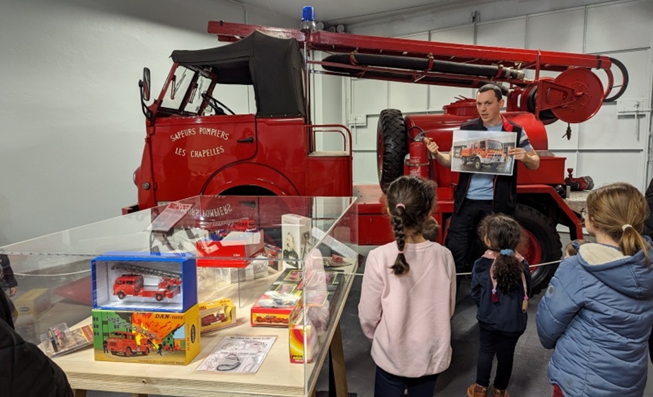 Après une visite de l’exposition sur les tenues et les casques, les enfants recréent l’habit d’un sapeur-pompier sur une silhouette en carton et en tissus. À la fin de la visite, ils peuvent monter dans un camion de pompier dédié aux feux de forêt.